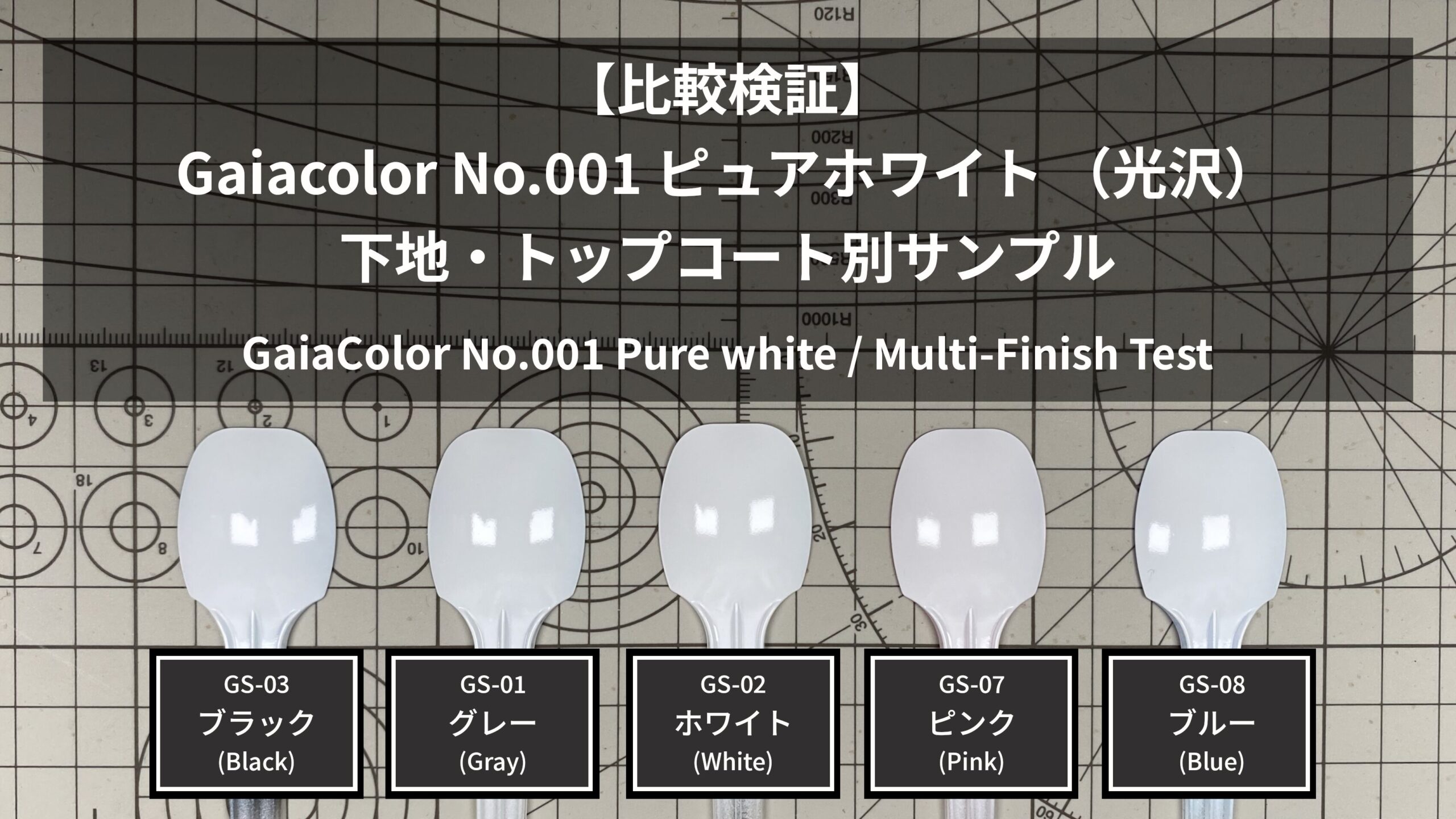 上記5色の下地の上に、ガイアカラー No.001 ピュアホワイト(gaiacolor)を塗布して隠ぺい力や発色の確認を行い、