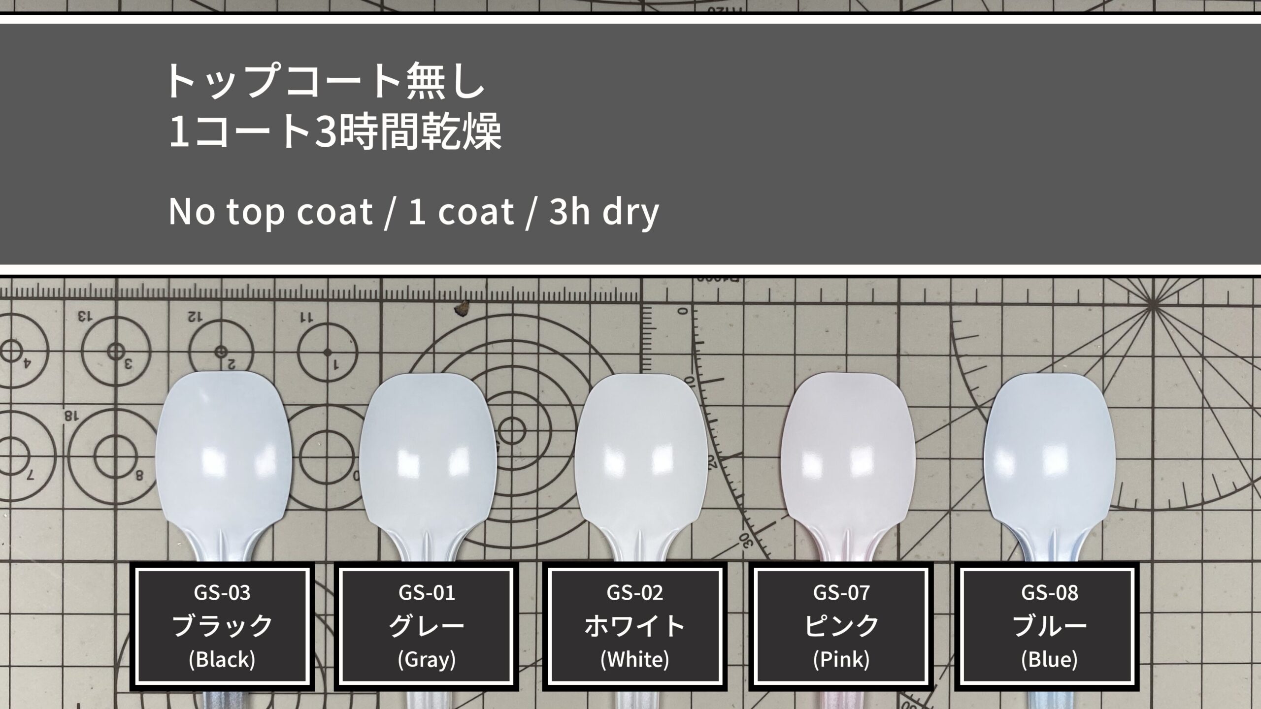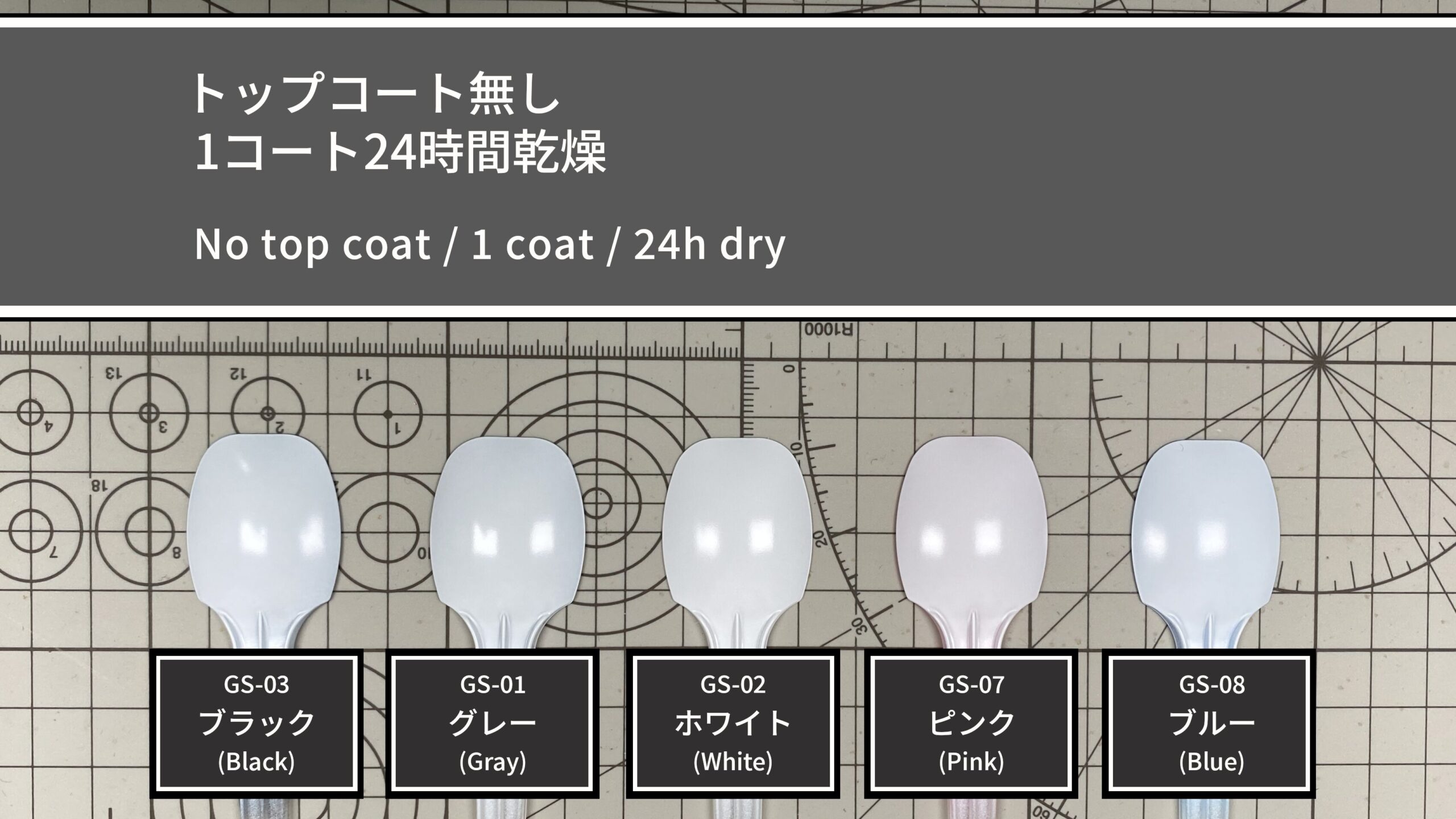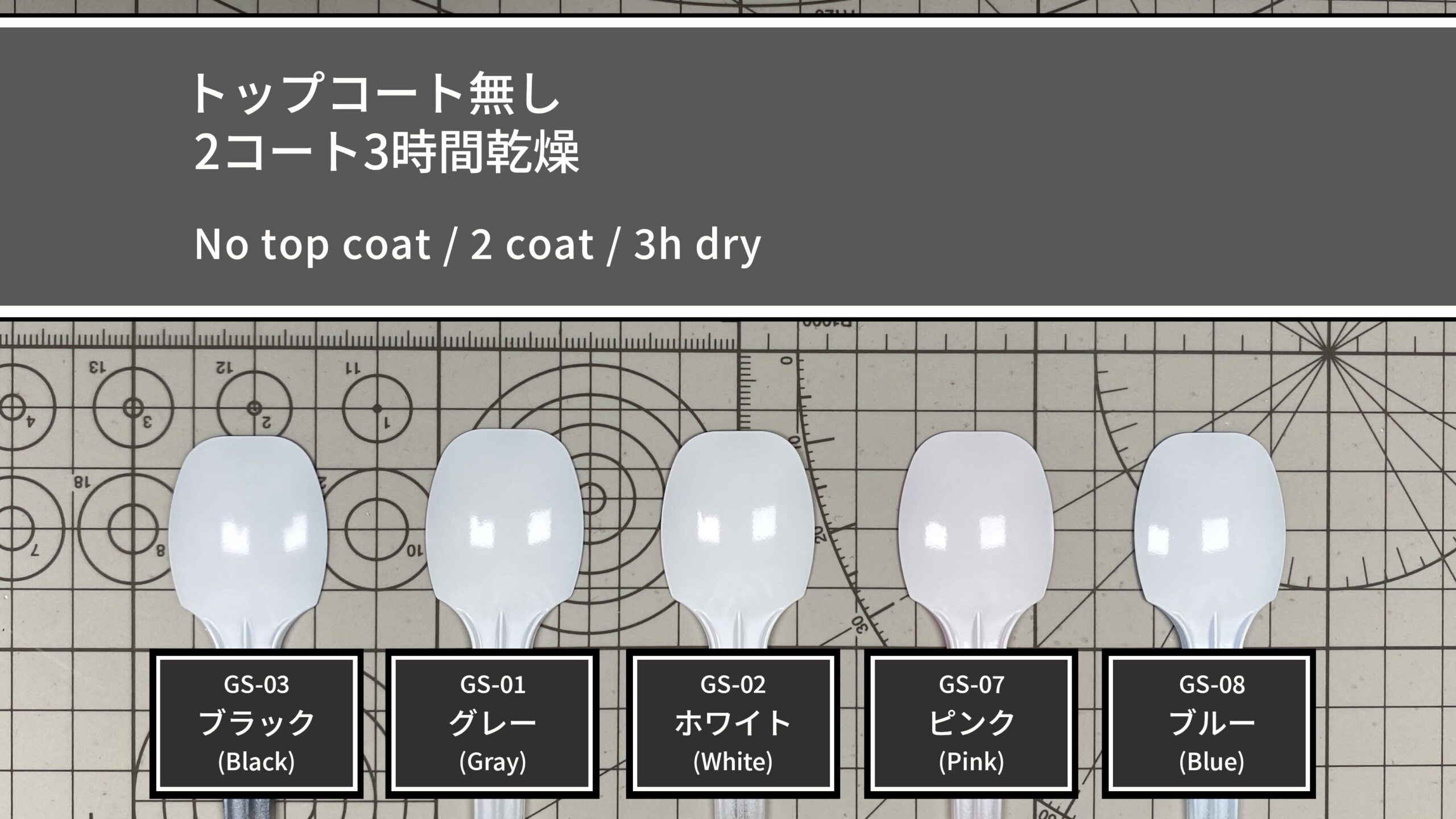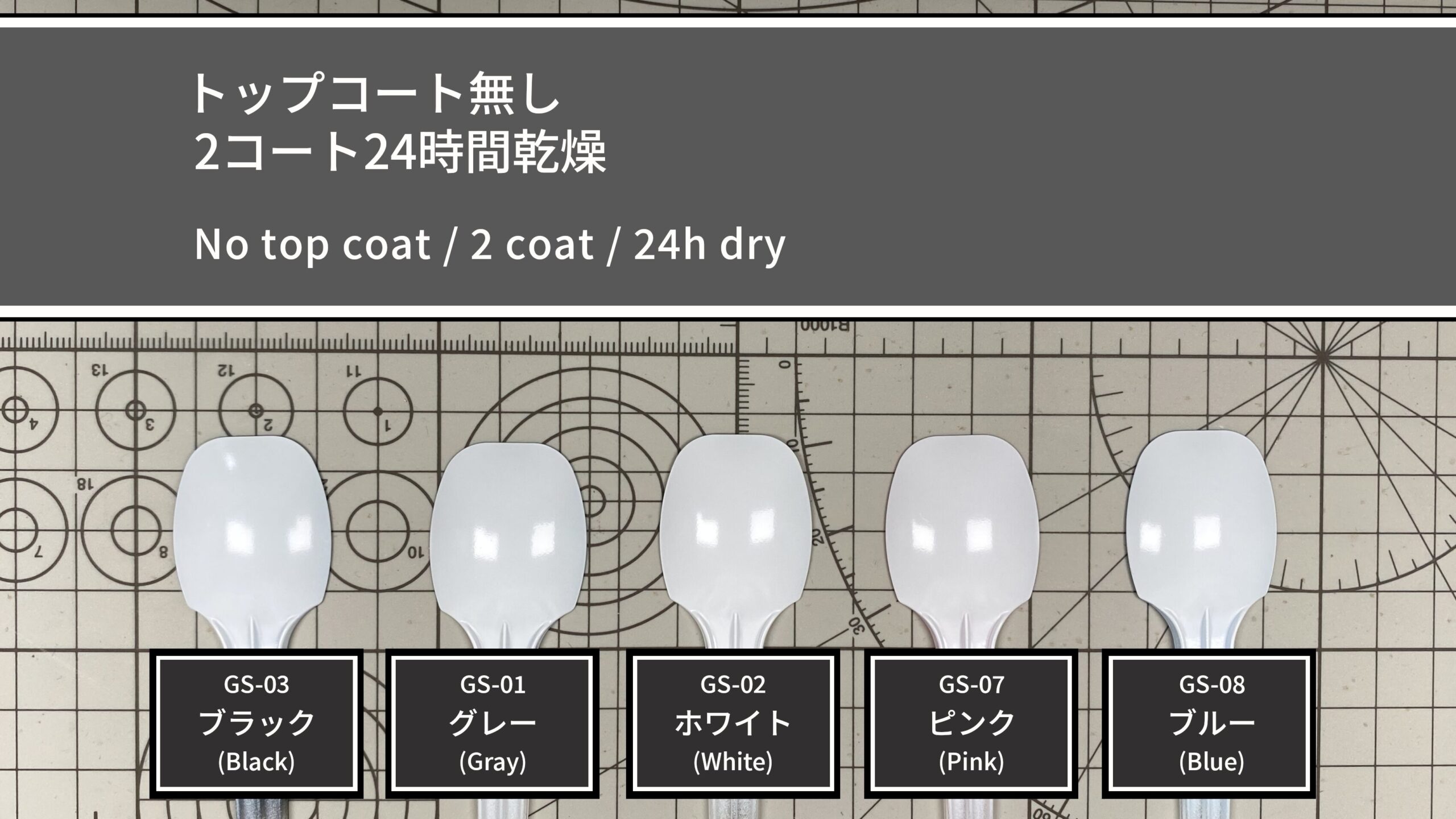 下地は1コートですが、サンプルには透明スプーンを使用しているため透け感が出やすく、作業効率を重視して両面塗装で透けを軽減しています。