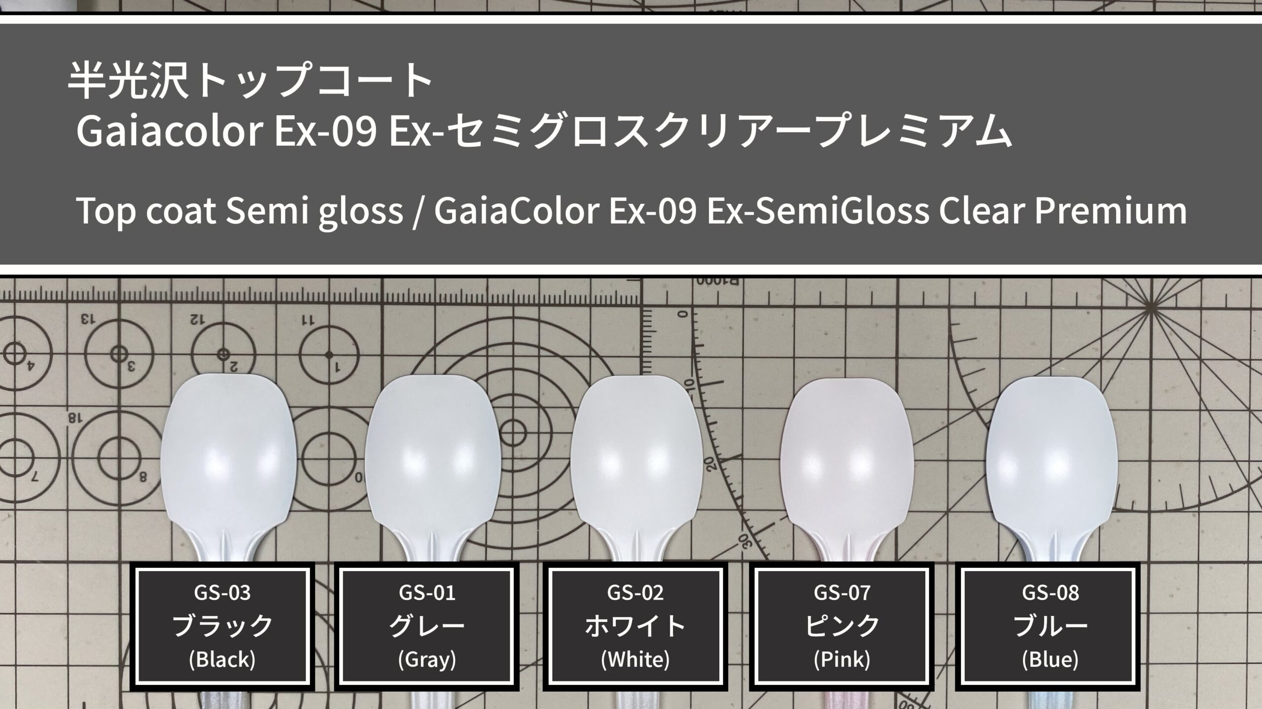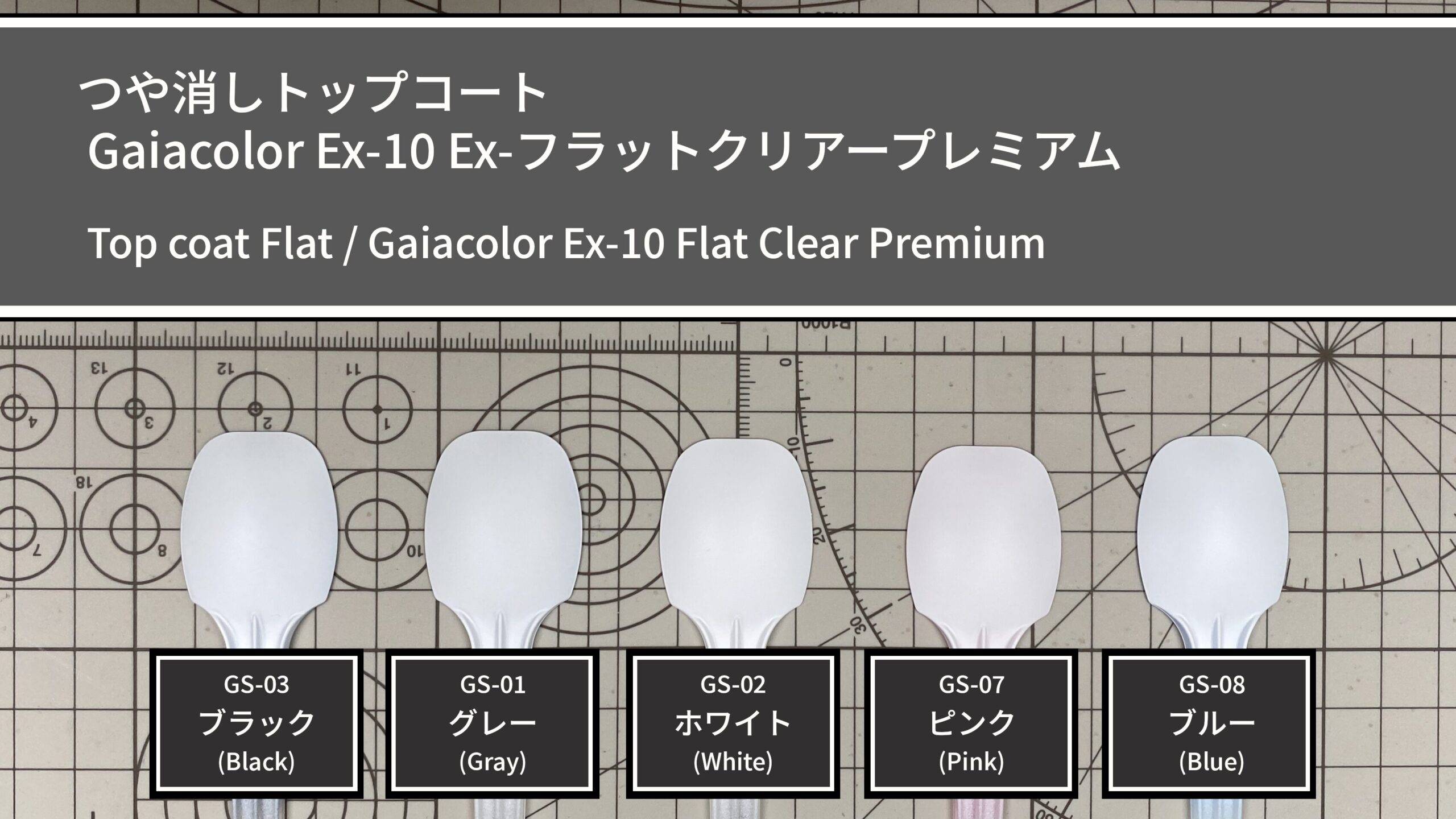 上記5色の下地の上に、ガイアカラー No.001 ピュアホワイト(gaiacolor)を塗布して隠ぺい力や発色の確認を行い、