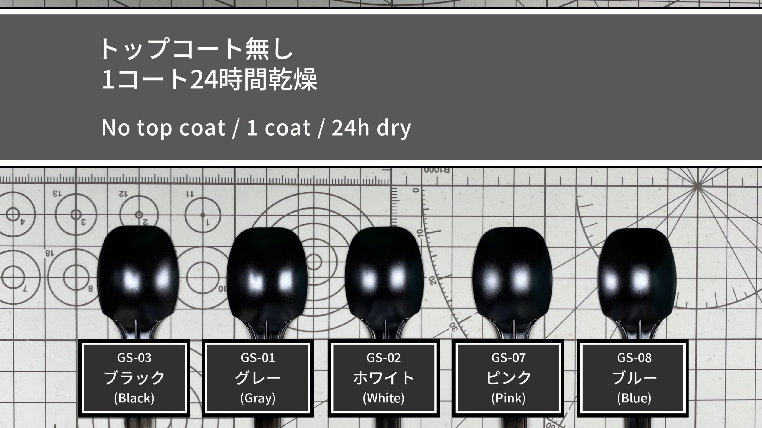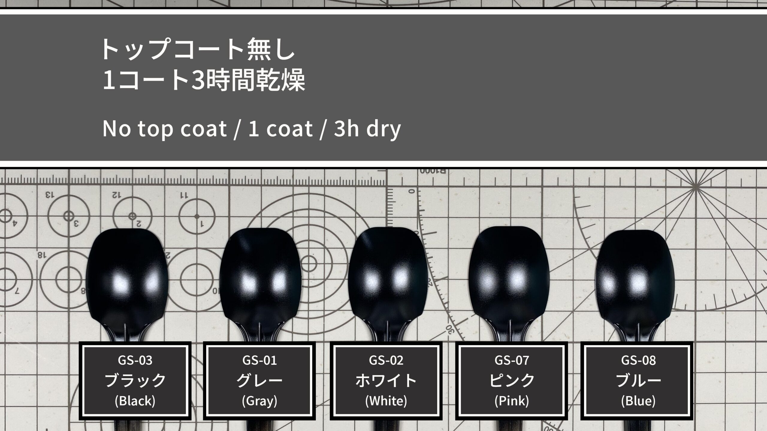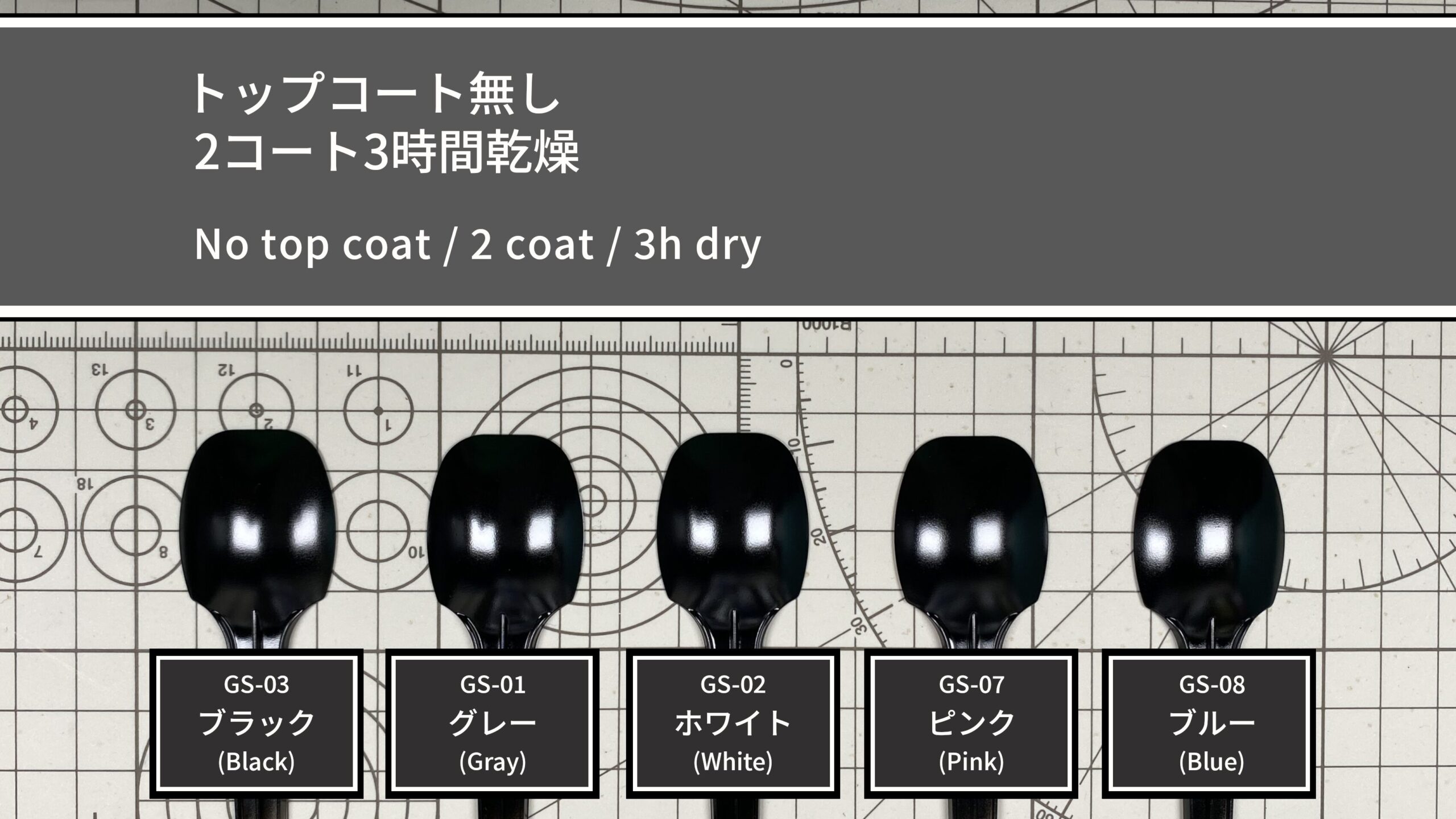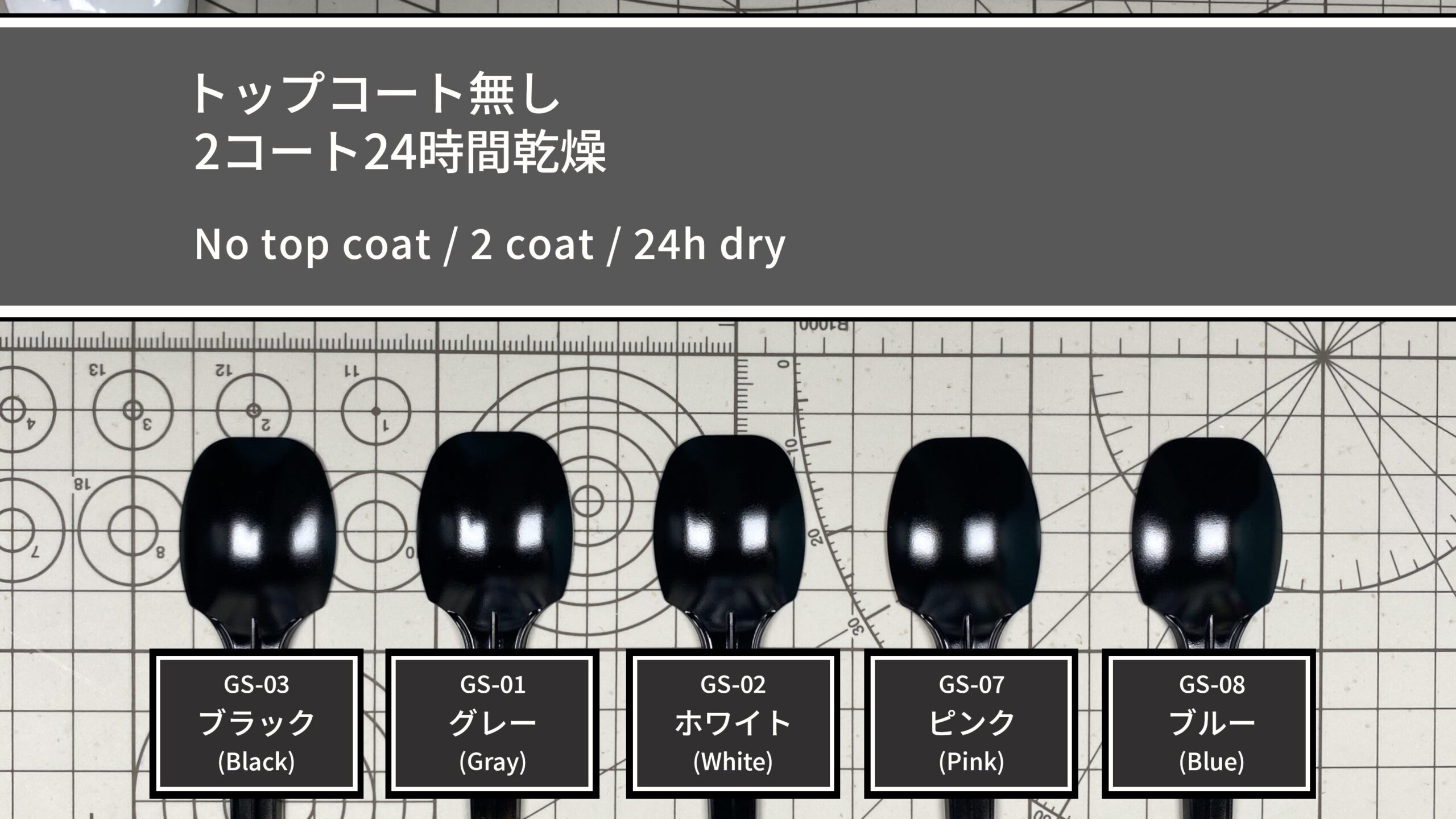 下地は1コートですが、サンプルには透明スプーンを使用しているため透け感が出やすく、作業効率を重視して両面塗装で透けを軽減しています。